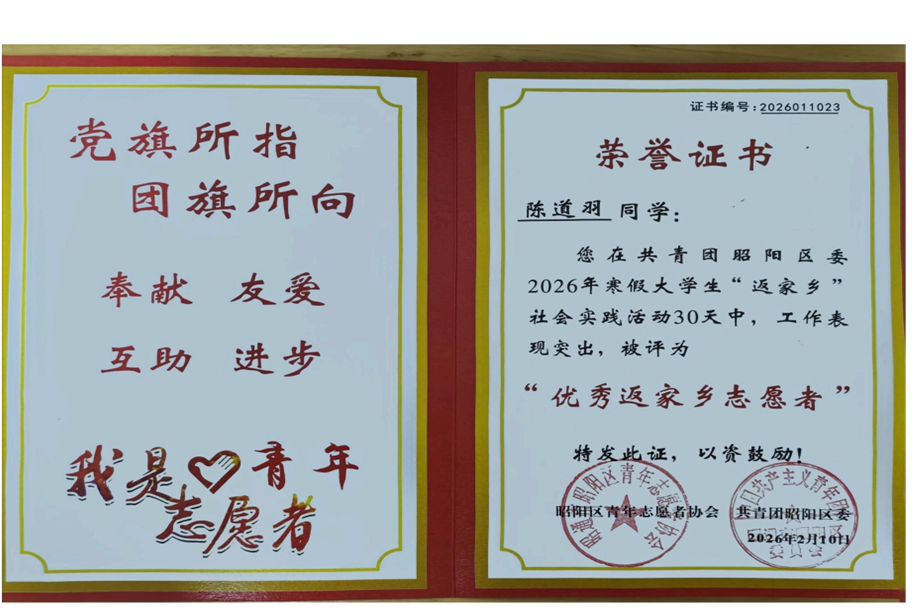 实践感悟:综合服务能力显著提升,荣获“优秀大学生”称号后更坚定了服务家乡、奉献社会的初心。今后将持续参与志愿服务,用专业所长为家乡发展贡献青春力量。