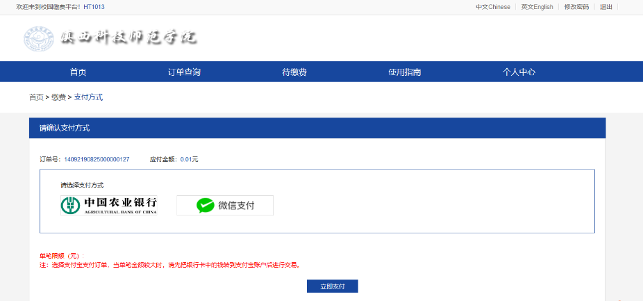 5.校园缴费平台有些缴费项目是与第三方系统通讯的,此种缴费可能会出现支付成功延迟到账,缴费成功后请耐心等待2-5分钟。